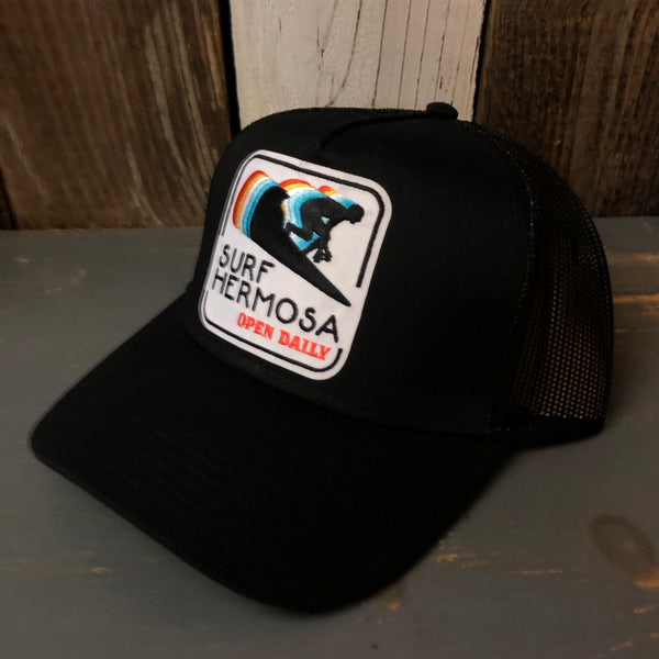 SURF HERMOSA :: OPEN DAILY - 5 Panel Mid Profile Mesh Back Trucker Hat - Black