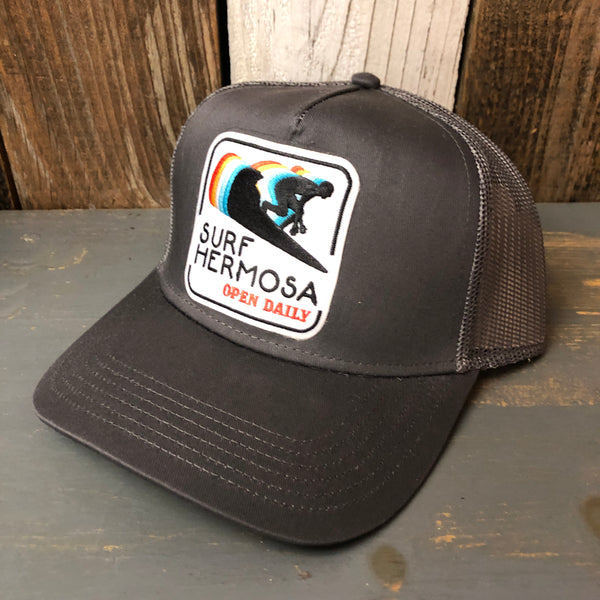 SURF HERMOSA :: OPEN DAILY - 5 Panel Mid Profile Mesh Back Trucker Hat - Charcoal Grey