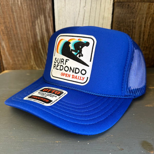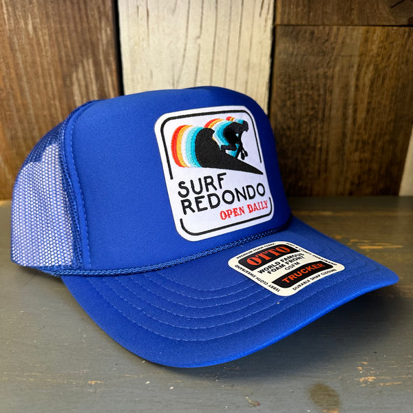 SURF REDONDO BEACH :: OPEN DAILY High Crown Trucker Hat - Royal Blue (Curved Brim)