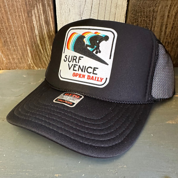 SURF VENICE BEACH :: OPEN DAILY High Crown Trucker Hat - Black (Curved Brim)