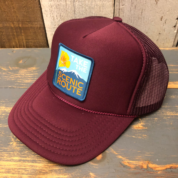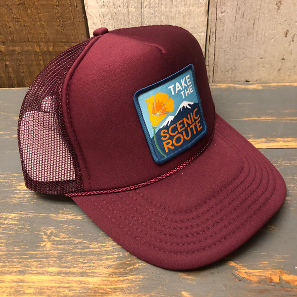 TAKE THE SCENIC ROUTE (Mountain/Flower) High Crown Trucker Hat - Burgundy Maroon