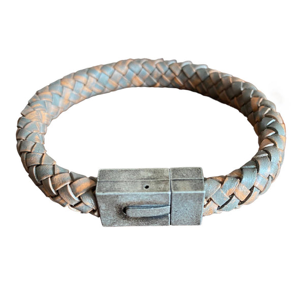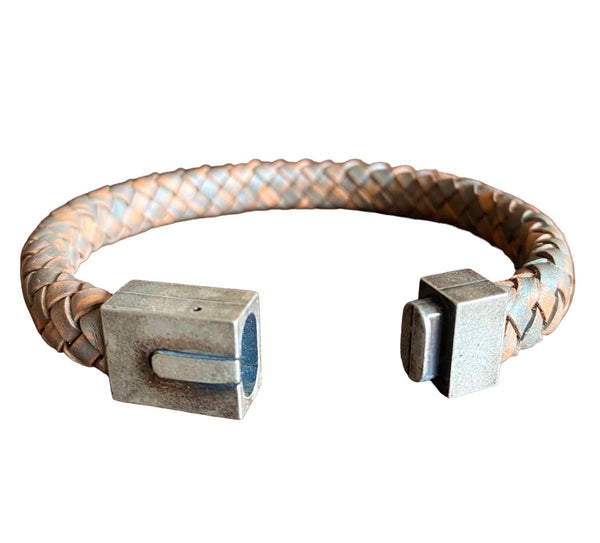 A distressed silver, magnetic clasp and distressed gray and brown braided leather pair perfectly for this fun and funky bangle. Pretty unique!