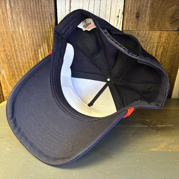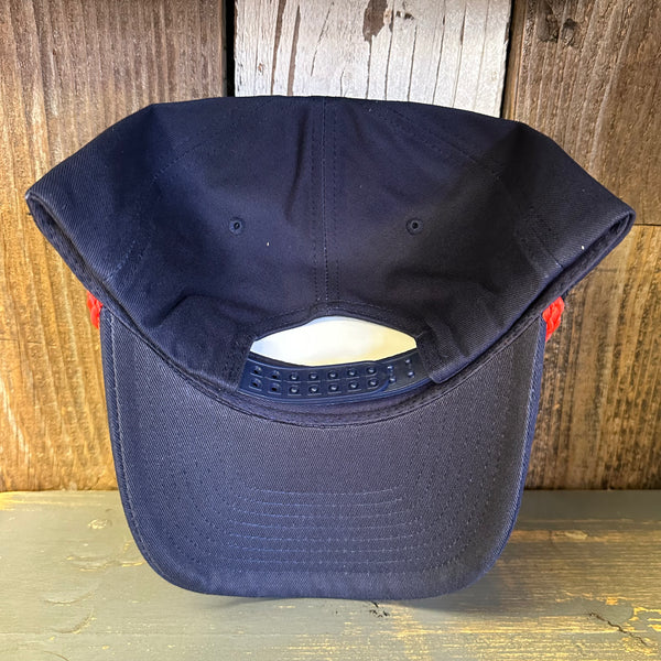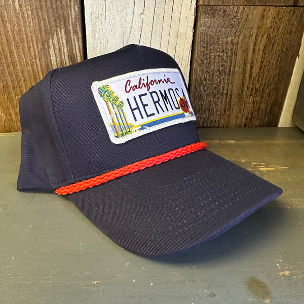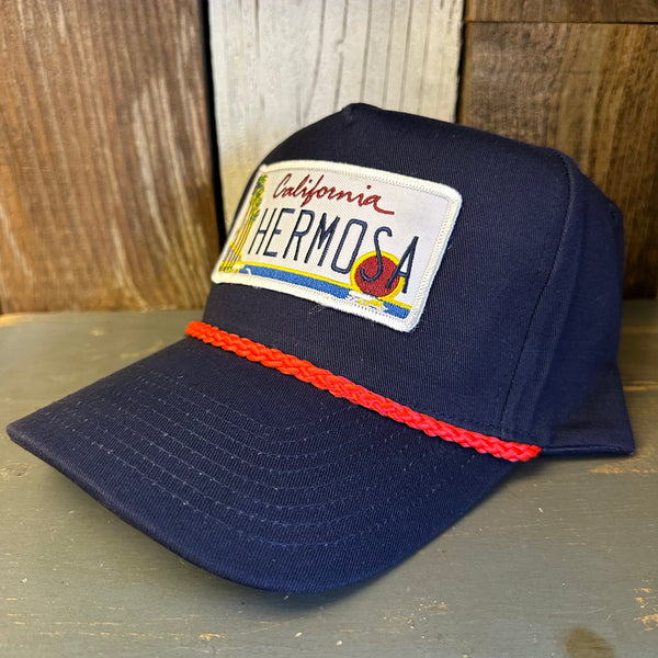 Hermosa Beach CALIFORNIA LICENSE PLATE 5 panel Rope Trucker Cap - Navy/Red Braid (Curved Brim)