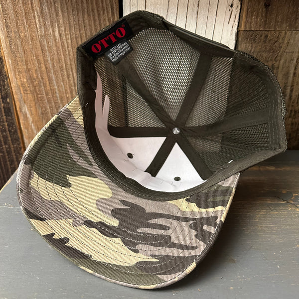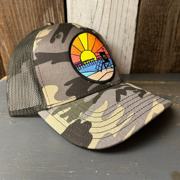 Hermosa Beach OBLIGATORY SUNSET 6 Panel Low Profile Trucker Hat - Camo/Olive Green Mesh