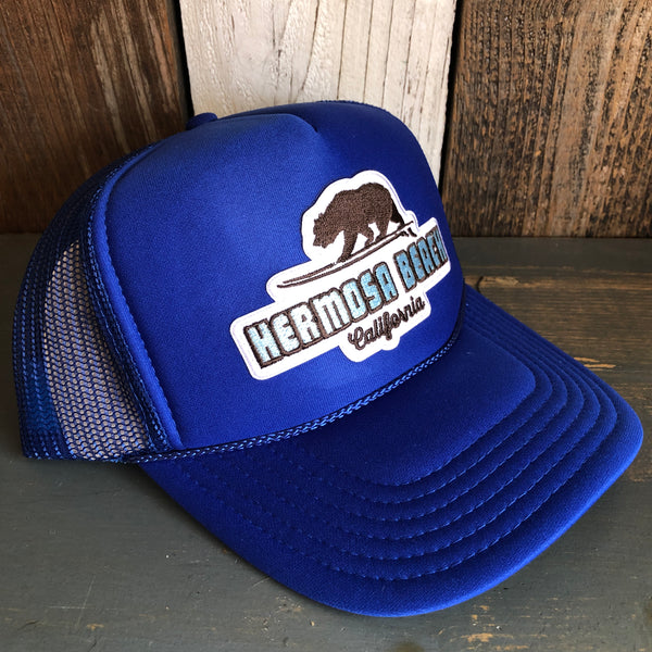 Hermosa Beach SURFING GRIZZLY BEAR High Crown Trucker Hat - Royal Blue (Curved Brim)