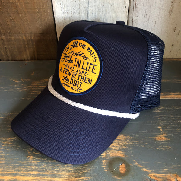 DIRT PATHS :: 5 panel Cotton Twill Front, Mesh Back, Rope cap - Navy/White Braid (OF ALL THE PATHS YOU TAKE IN LIFE...MAKE SURE A FEW OF THEM ARE DIRT - JOHN MUIR)