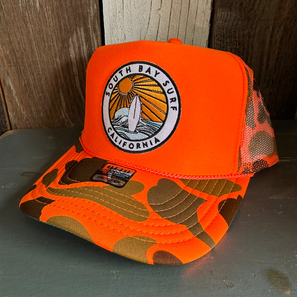 SOUTH BAY SURF (Multi Colored Patch) High Crown Trucker Hat - Neon Orange Hunters Camo