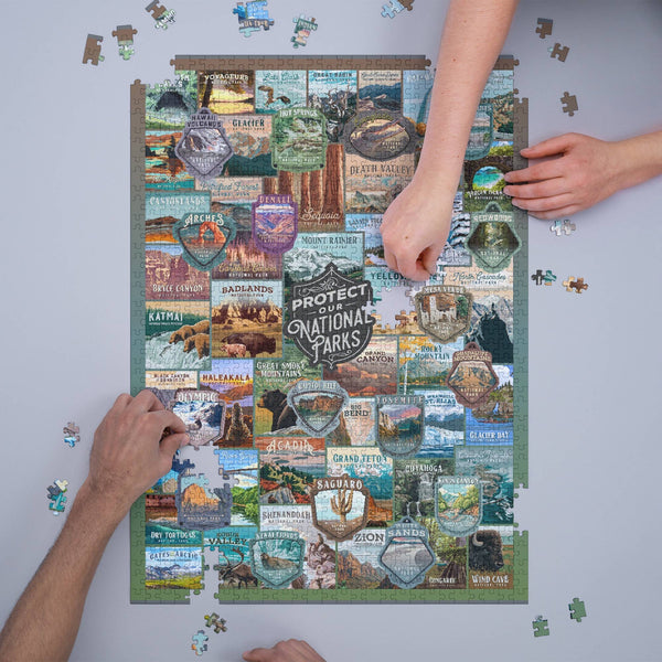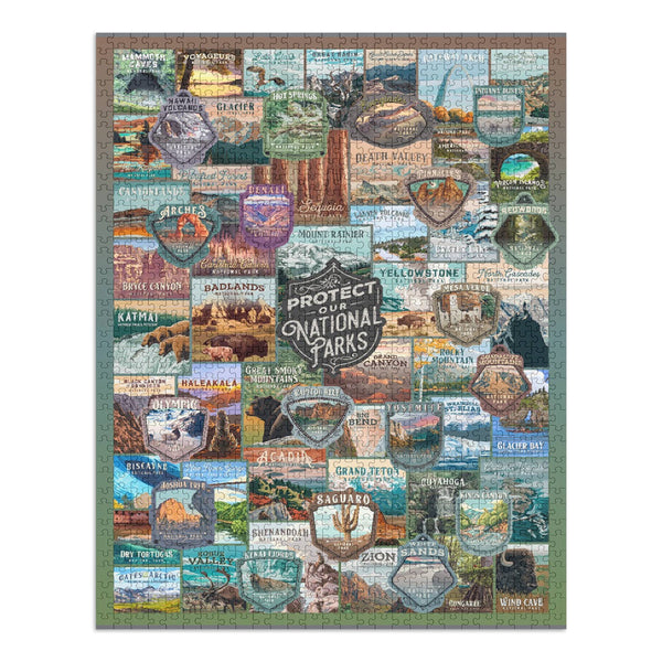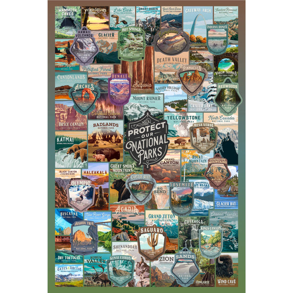 Protect Our National Parks - Collage 1000 Piece Puzzle • 1000 piece puzzle • Glare-free matte finish • Printed with Eco-friendly inks • 100% Made in America • 11 x 17" reference poster included inside. • Puzzle Size - 19 x 28.5 inches • Puzzle Box Size - 9 x 9 x 2