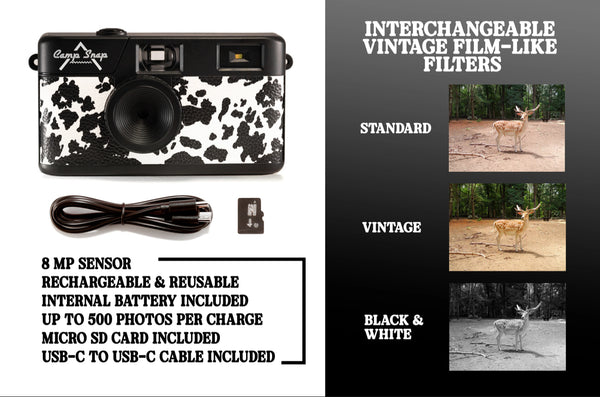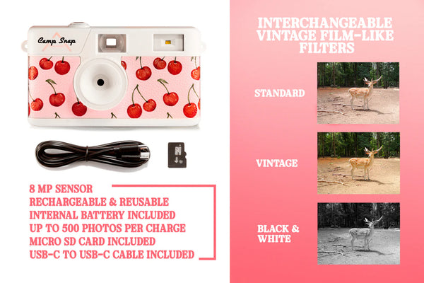 CAMP SNAP is thrilled to provide this screen-free experience.  With its durable design, long-lasting rechargeable battery, vintage look, and effortless storage capacity, you'll have everything you need to capture memories that last a lifetime.