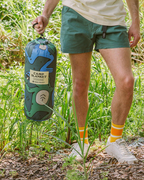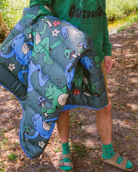 Join our dancin’ frogs in the great outdoors this season. Be sure to grab our recycled camp blanket and hit up a park near you.