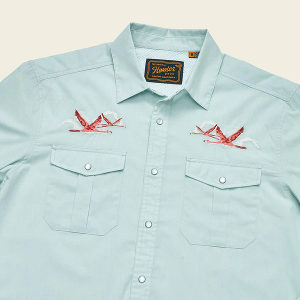 Our desire to make the Gaucho Snapshirt is one of the reasons we started Howler Brothers in the first place. We wanted to transform the vintage western shirts of the past into something technical and wearable in everyday life while maintaining a little of their quirky nature and penchant for unique, embroidered artwork. We succeeded in a big way by making ours out of lightweight, quick drying cotton-poly blend and adding a cooling mesh-lined vented back yoke to keep it cool when the temperatures are cooking. We threw in pleated chest pockets, pearl snaps, and an ever-evolving slate of custom embroidery.