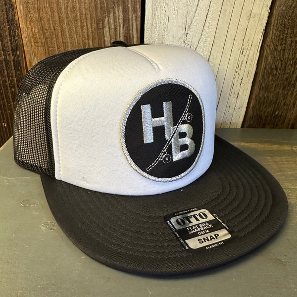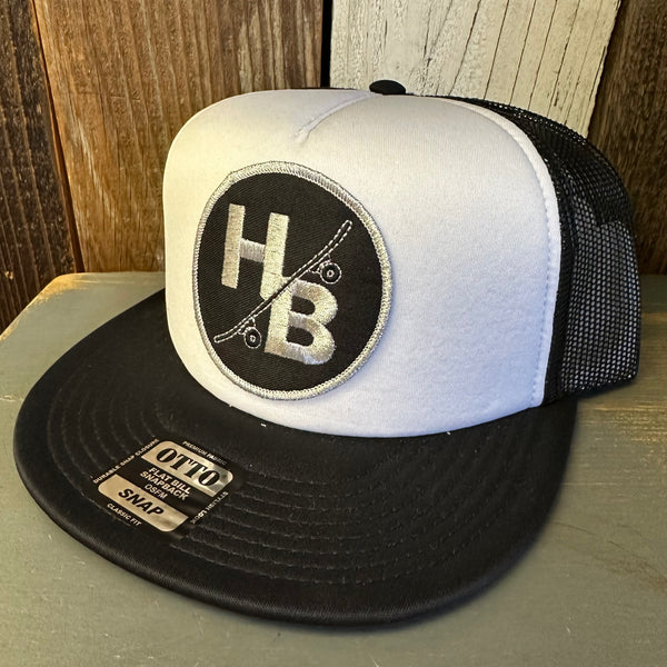 Hermosa Beach SKATEBOARDING WAS NEVER A CRIME Trucker Hat - Black/White (Flat Brim)