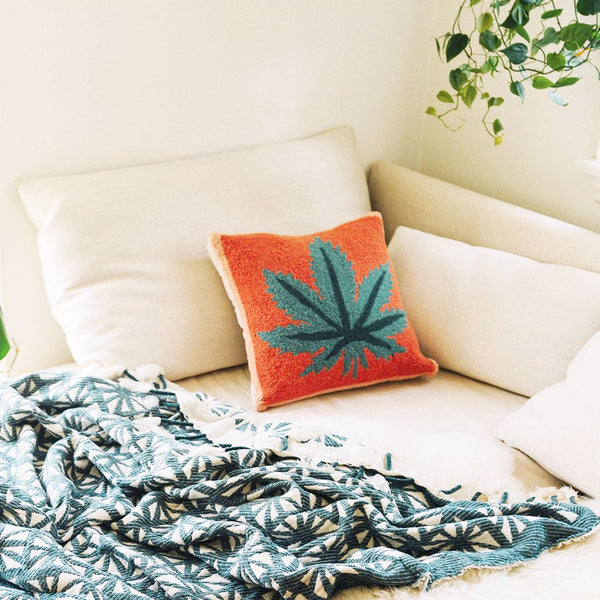 We're loving the bold contrasting colors of the teal leaf motif against the fresh peachy-orange background. The square shape is easy to toss anywhere – a 'chill out chair', a cozy pillow pit on the floor... the list goes on!