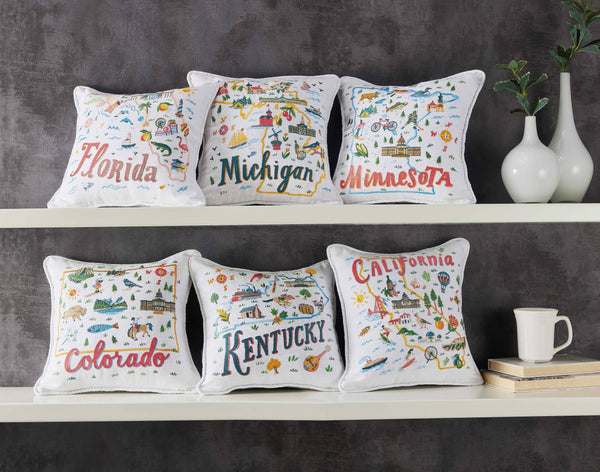 ★100% embroidered accent pillow ★95% Ramie & 5% Cotton ★Includes polyester insert, zipper closure ★14x14" throw pillow ★Minimum 2 ★Designed by Angela Staehling