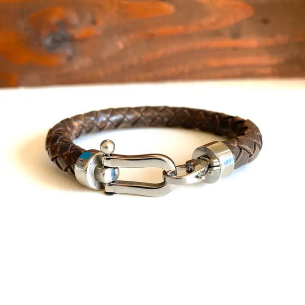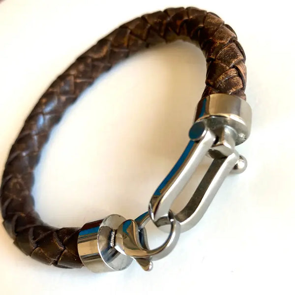Chunky, distressed, braided leather with beautiful stainless steel clasp.