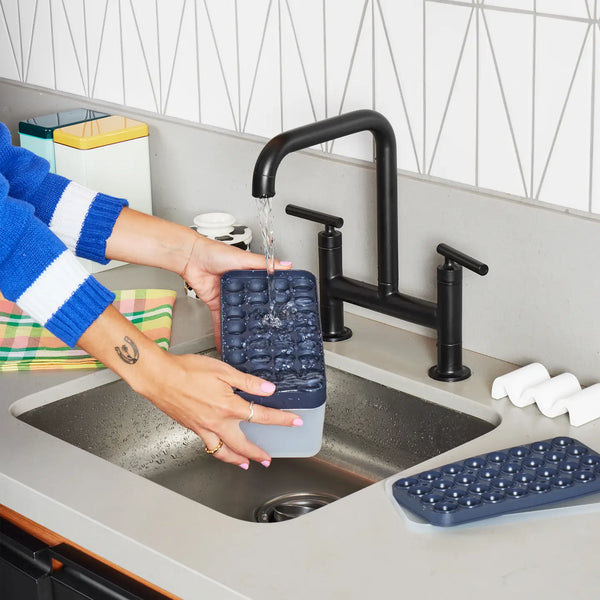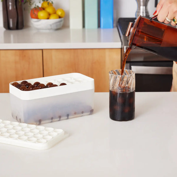 The Ice Ball Box holds three trays of perfect ice balls that instantly elevate all of your drinks, from water to cocktails. Liven up your drinks by freezing juice, infusing ice with citrus and other fruits, or even leftover coffee to elevate your iced drinks. Perfect for Gifting: Refresh their kitchen, their barware sets, and new home/ apartment living spaces with our best in class ice trays! Easy Freezing: Fill the rigid bottom tray then snap on the pure silicone lid so filling is a breeze and ice removal is even easier. The storage lid keeps freezer odors out and allows for easy stacking and freezer organization Compact Profile: Make and store 96 perfect ice balls in one compact storage solution for a fun & festive upgrade to everyday drinks The Best Materials: Ice tray lid is made from soft premium silicone while the bottom tray, lid and storage container are made from durable BPA-free plastic