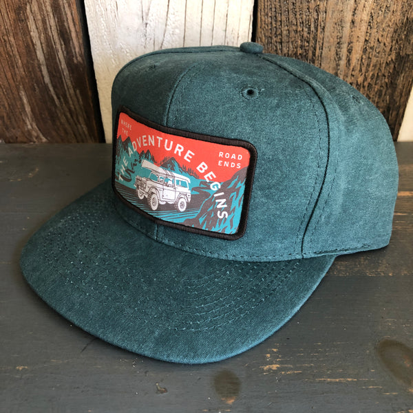 WHERE THE ROAD ENDS :: THE ADVENTURE BEGINS - 6 Panel Mid Profile Baseball Cap - Dark Green